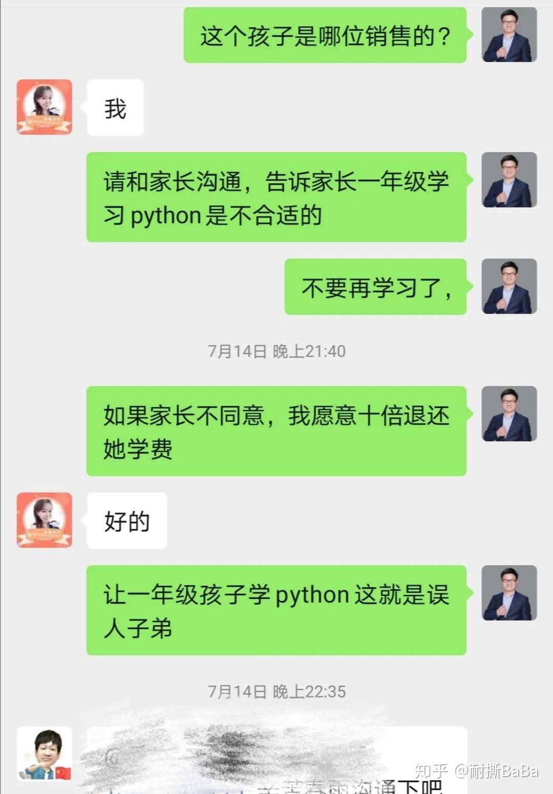 第三个故事:有一年级家长从其他机构试听完,买了我朋友机构的9.9元试听课,非要学Python,说其他机构会收,你为啥不收,在机构家长群里吵架。最后我朋友说实在不能教,先把数学学好吧,10倍退你钱也不能教。