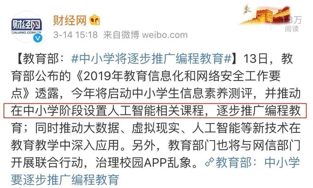 在《新一代人工智能发展规划》,就明确提出要“实施全民智能教育项目, 在中小学阶段设置人工智能相关课程,逐步推广编程教育,鼓励社会力量参与寓教于乐的编程教学软件、游戏的开发和推广。