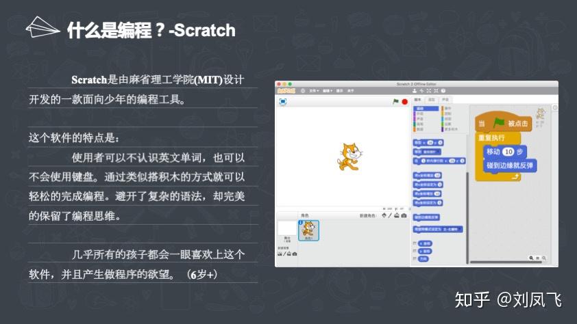 Scratch是由麻省理工学院(MIT)设计开发的一款面向少年的编程工具。