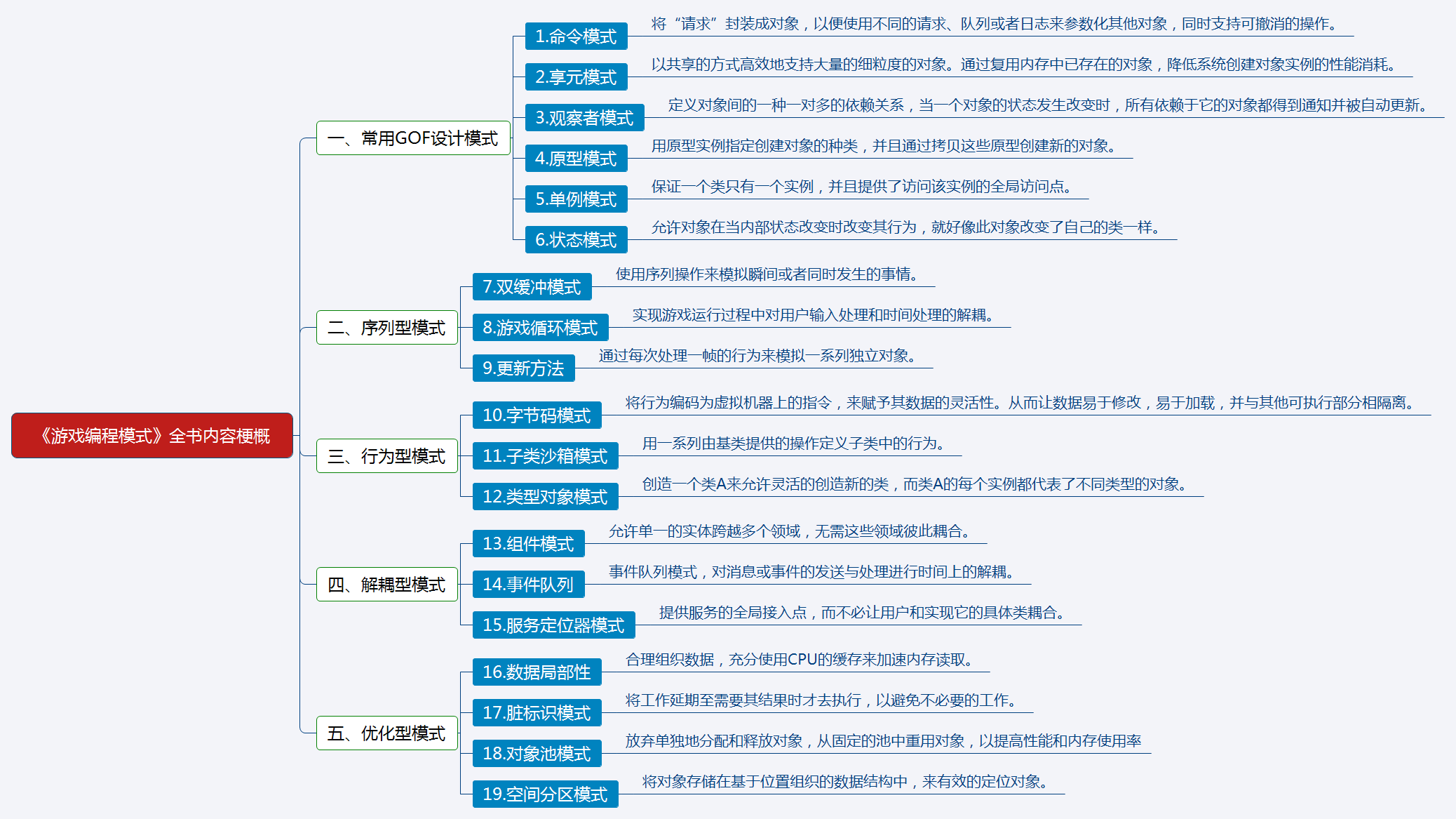 以下是《游戏编程模式》一书的内容梗概,全书内容19种模式的思维导图: