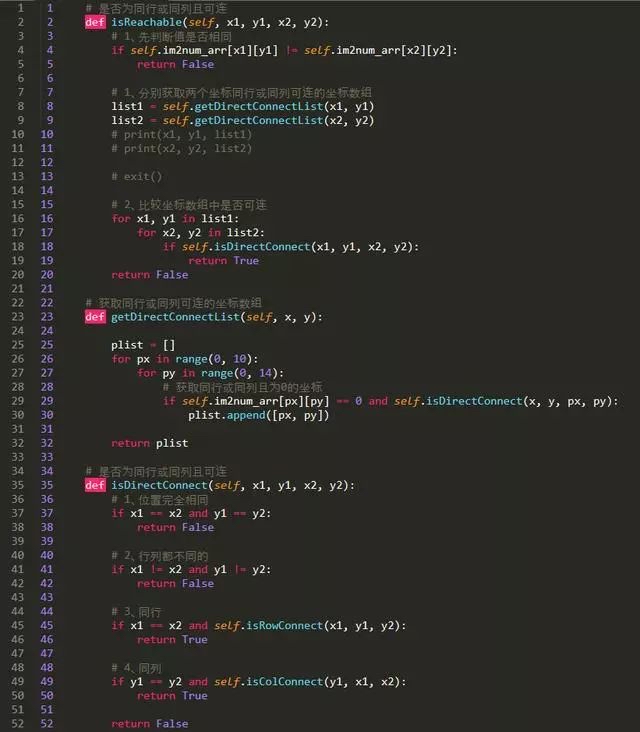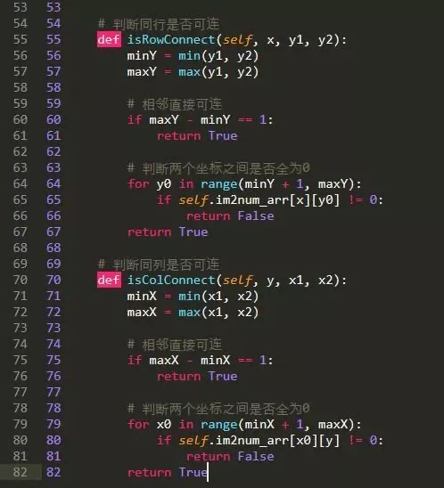 简单分析下代码实现过程:在isReachable()传入两个需要比较的坐标值,然后分别获取两个点横竖向(isRowConnect()、isColConnect())可以连接的坐标集合,最后再对集合进行遍历比较是否存在可连的,如果存在则表示传入的两个坐标是可以连接的。