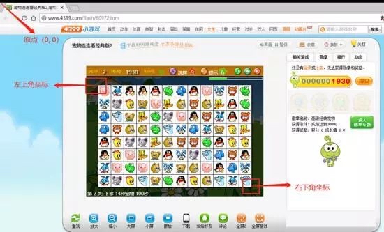 浏览器打开游戏窗口(单个一个窗口),游戏界面如下图所示,游戏主要界面截图需要两个坐标(左上角坐标和右下角坐标)来确定,原点一般是屏幕左上角,不确定坐标点值的同学,可以全屏截图,用编辑图片软件查看坐标值。获取窗口句柄,这里就是浏览器标题栏的标题了(右键-查看源代码-title,加上软件名)比如:“宠物连连看经典2,宠物连连看经典版2小游戏,4399小游戏 www.4399.com - Google Chrome“。获取窗口句柄就可以开始了。