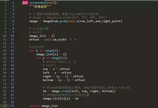根据初始化设定的左上角和右下角两个坐标,使用ImageGrab.grab()方法进行截图,传入一个元组即可,然后对这个大图进行分割,切割成一个个小图标存入到images_list数组中。
