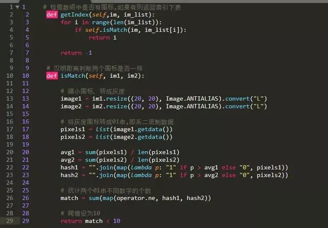 上面的getIndex就是对比图片,判断图标是否出现过(是否已存在image_type_list中,没出现则追加进去),这里使用汉明距离判断两个图片的相识度,设置阀值10,当小于阀值则认为是同一个图片,具体代码如下: