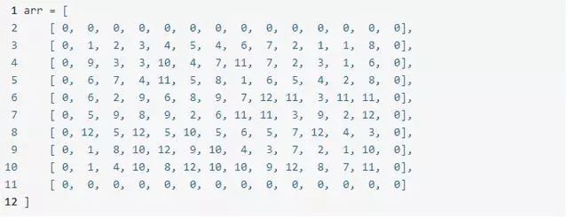 通过上面的开发流程,基本获取如下这样的矩阵,只要比较两个编号相同的值进行可连路径寻找,如果找到即进行模拟点击操作。这里简单介绍下游戏规则:8行乘12列游戏图标区域,外围的0其实表示寻找路径的时候可以通过,例如坐标(1, 1)可以与(1,10)进行连接、(7, 1)和(7,2)进行连接。
