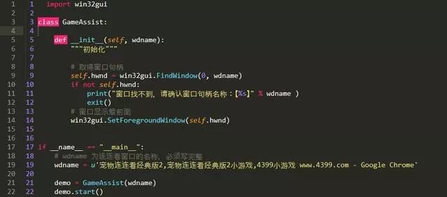 python可以使用win32gui模块调用Windows API实现对窗口的操作,使用FindWindow()方法可以获取窗口的句柄(handle),需要传入两个参数,第一个为父窗口句柄(这里填0即可),第二个参数是窗口的名称(标签title - Google Chrome)。获取句柄之后然后通过SetForegroundWindows() 设置窗口在前面,这里传入游戏窗口的举报即可,代码如下: