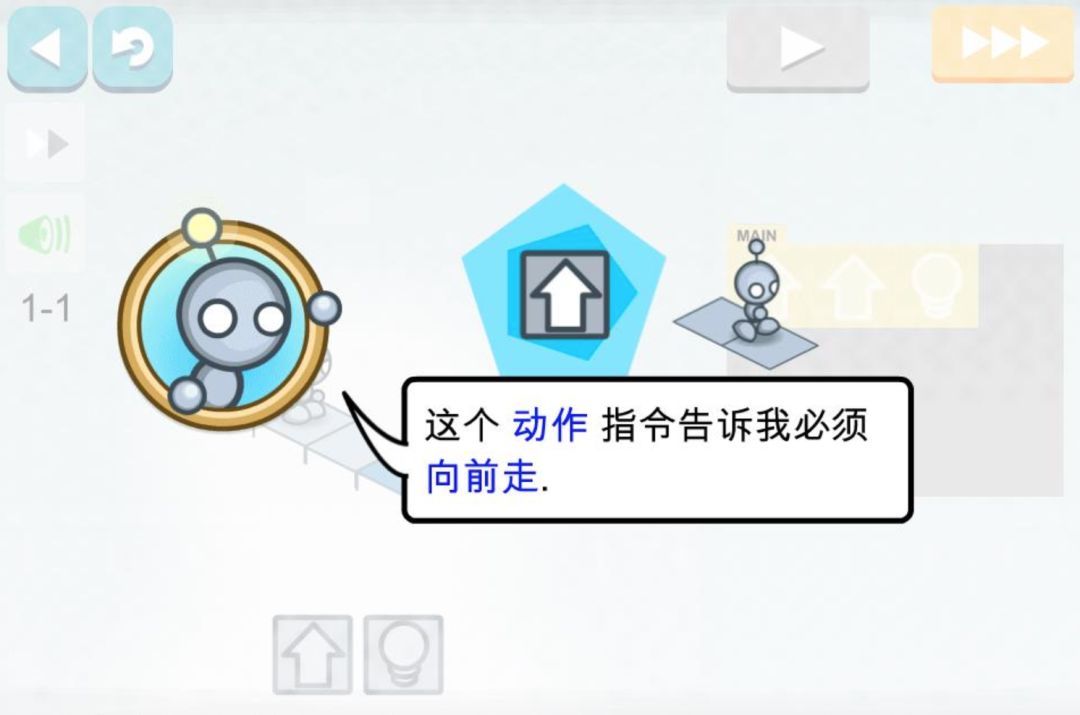 你需要在右边的指令框内放入一些简单的命令,比如前进,左/右转弯,跳过台阶,点灯/激活道具等等,还能调用F1、F2两个指令框,以实现较为复杂的循环。