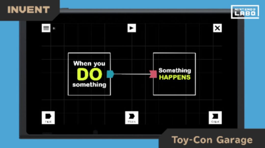 我们常见到面向对象,面向过程的编程方式,而 Labo 采用的是已经封装好的事件触发驱动的编程方式。简单来说,就是设定好当你对 Joy-Con 、 Toy-Con 或是机器本体做了什么事的时候,该触发什么效果。编程的方式也简单明了,把代表事件的 Input 方块,和代表触发效果的 Output 方块用线连起来就可以了。