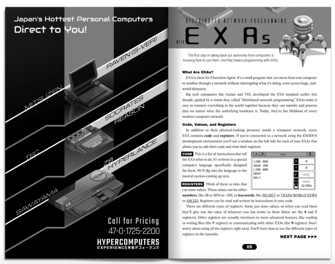 此外,这个世界上存在着名为 EXecution Agent,简称 EXA 的蜘蛛型纳米机器人,它像电脑病毒一样,能在电脑主机间复制、传播,你可以给它们编写“简单”(才怪)的脚本,黑掉街对面的披萨店,破解银行的ATM机(让它往街上喷钱),修改掌上游戏机的代码,编写游戏程序并分享给其他玩家,甚至能用于修复自己的手臂神经……牛逼吧?