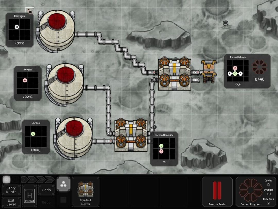 除了刚开始的教学关卡外,玩家需要在两个不同的层面上设计组织化工生产线。