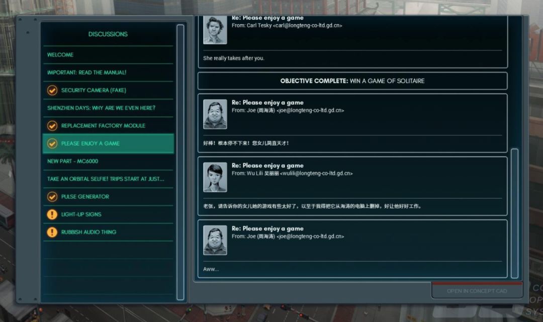 相对来说,《深圳 IO》的叙事深度更加丰富多彩,你将扮演一名跑到深圳华强北打工的外国程序员,专门为各种电子设备编写嵌入式程序。在工作中,你不但能接触到其他同事,甚至还能在电脑上开一个麻将版本的空当接龙来摸鱼…
