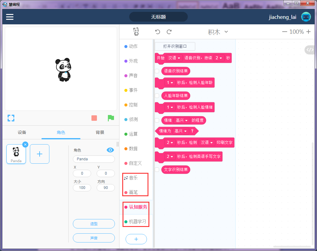 对于Scratch原有的角色编程,慧编程更是增加了“音乐/画笔“以及“认知服务和机器学习“等人工智能的编程模块。