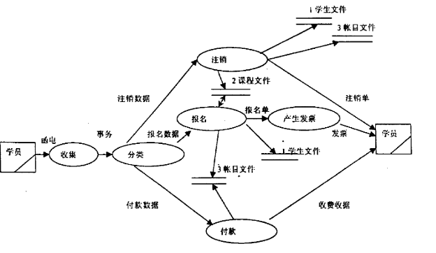 (1)如果是报名的,则将报名数据送给负责报名事务的职员,他们将查阅课程文件,检查该课程是否额满,然后在学生文件、课程文件上登记,并开出报告单交财务部门,财务人员开出发票给学生。
