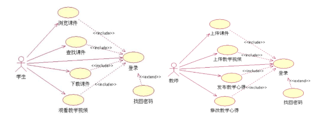 学生登录网站后,可以浏览课件、查找课件、下载课件、观看教学视频。教师登录网站后,可以上传课件、上传教学视频、发布教学心得、查看教学心得、系统管理员负责对网站页面的维护、审核不合法课件和不合法教学信息、批准用户注册。