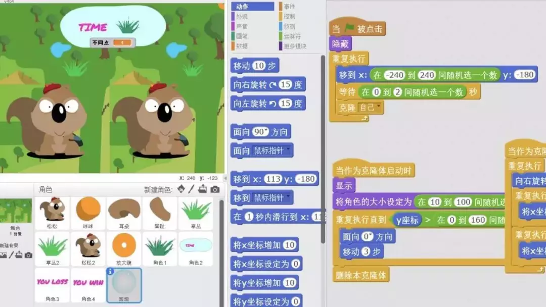Scratch界面8 到 13 岁的孩子们将会受益于 Scratch 简单的图形界面。Scratch 可以通过拖拽代码块将它们拼在一起。不可计算的代码片段则无法组合,这样杜绝了字面上的语法错误。Scratch 对那些不会打字的小孩子们来说非常有用。