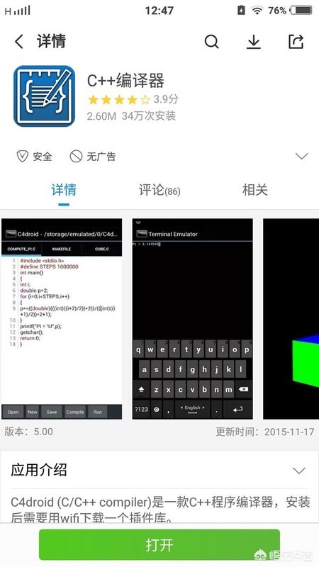1.首先,安装C++编译器,这个直接在手机应用商店中搜索就行,如下,大概也就2.6兆左右,直接下载安装: