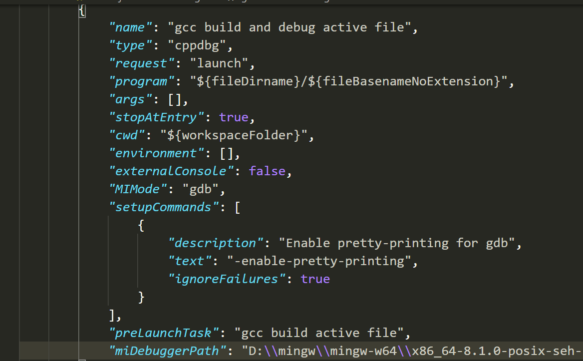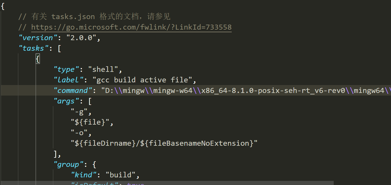 通过菜单 Terminal 选择 Configure Default Build Task... 或者 Configure Tasks... 然后选择 C/C++: gcc build active file,在当前项目目录(工作区)下自动生成.vscode/tasks.json 配置文件,构建任务的简要配置范例 tasks.json 如下,其中"command"是指明编译器;"args"是编译器 gcc 的参数;"isDefault"为 true 表示同时按 Ctrl+Shift+B 快捷键自动执行默认构建任务(Default Build Task)。