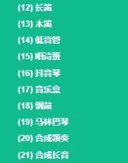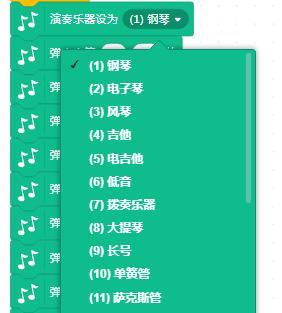 “演奏乐器”积木块的说明:这个积木块可以选择21种乐器,这里选择钢琴。