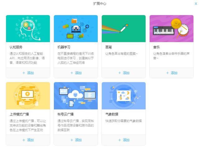 2、如下图,在弹出的“扩展中心”对话框中有7个选择:认知服务、机器学习、画笔、音乐、上传模式广播、账号云广播和气象数据,我们在“音乐”下点击“添加”。