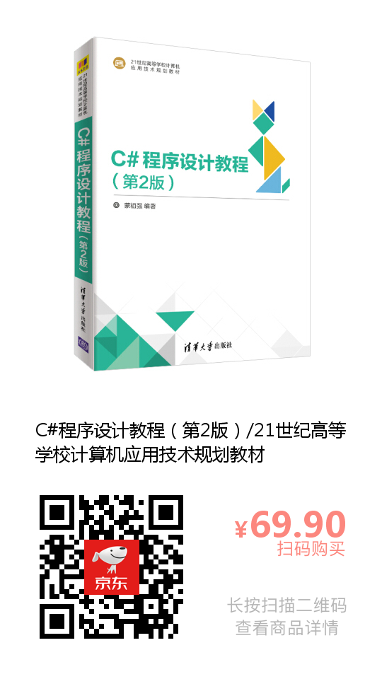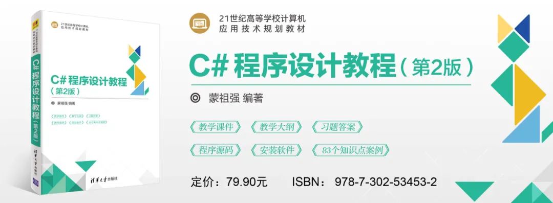 蒙祖强编著. C#程序设计教程(第2版). 北京:清华大学出版社,2019年9月.