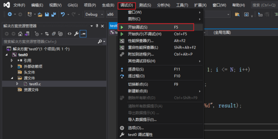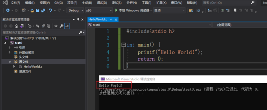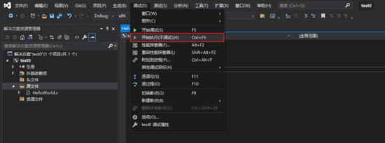 接下来运行刚刚写的代码,验证一下环境是否OK,点击调试-->开始执行(不调试)或者直接快捷键CTRL+F5