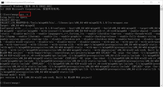 在命令行里输入 gcc -v ,输出以下版本信息则表示 minGW 配置OK
