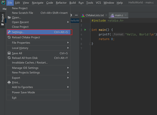 纯净的环境下刚安装好是不能运行这段代码的(如果之前装了VS的C语言环境或者MinGW环境,这里就会自动选用,代码就可以运行),还需要配置编译环境,这里点击File->Settings