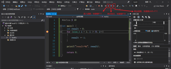 调试时可以点击窗口中的按钮,也可以使用快捷键