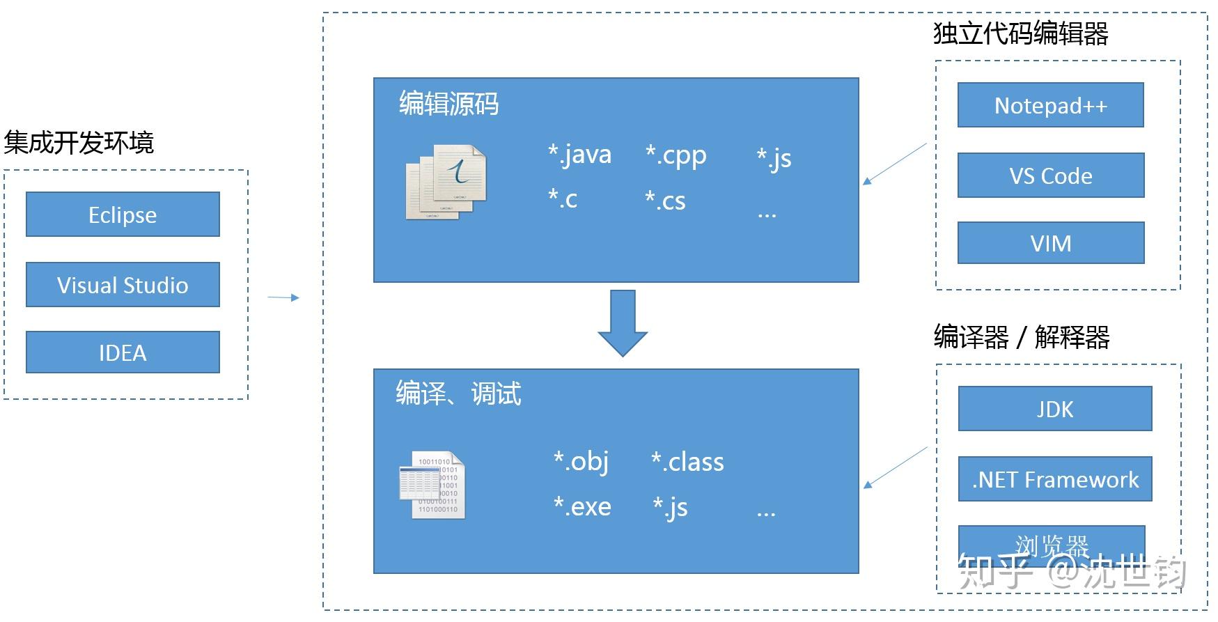 例如Java的集成开发环境有Eclipse和IDEA,Visual Studio支持C#、C++等一系列微软系语言。