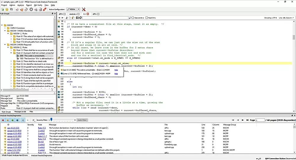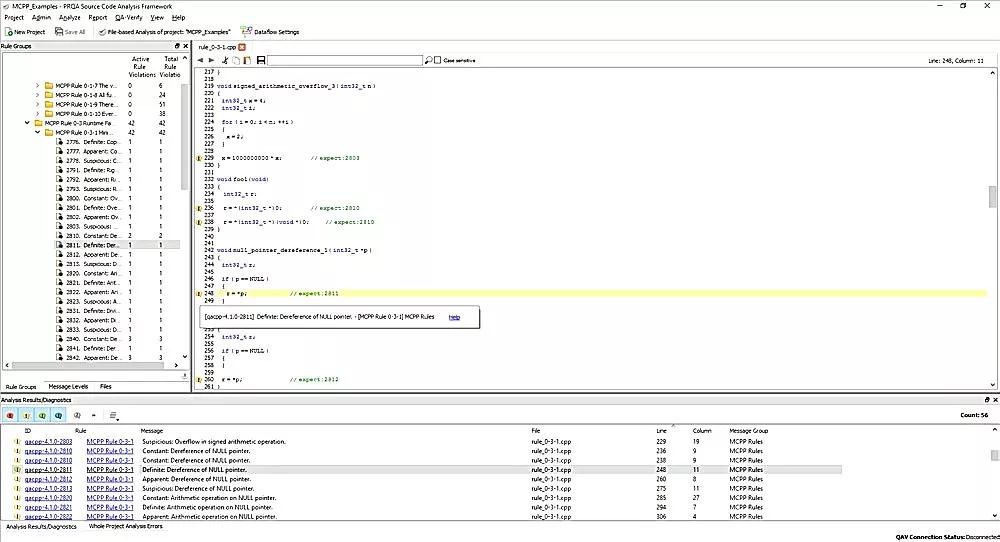 ① MISRA编码标准检查安全关键系统的潜在问题。MSIRA C和MISRA C++合规性模块指出违背这些规则的代码段。