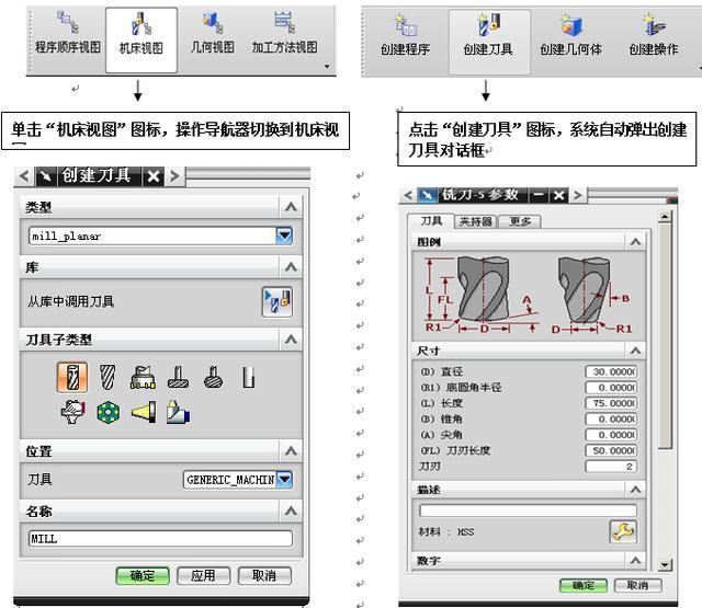 刀具是从毛坯上切除材料的工具,用户可以根据需要创建新刀具。基于选定的CAM配置,可创建不同类型的刀具。在“创建刀具”对话框中,当选择“类型”为drill时,能创建用于钻孔、镗孔和攻丝等用途的刀具;当类型为mill-planar时,能创建用于平面加工用途的刀具;当现在类型为mill-contour时,能创建用于外形加工用途的刀具。