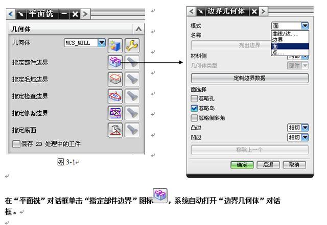 平面铣加工时,加工区域是由边界几何体所限定的。在操作对话框中,可以看到边界包括部件、毛坯、检查和修剪的四种形式,用于计算刀位轨迹,定义刀具运动范围,而底面控制刀具切削深度。如图3-1所示