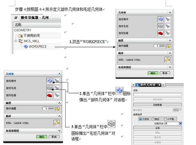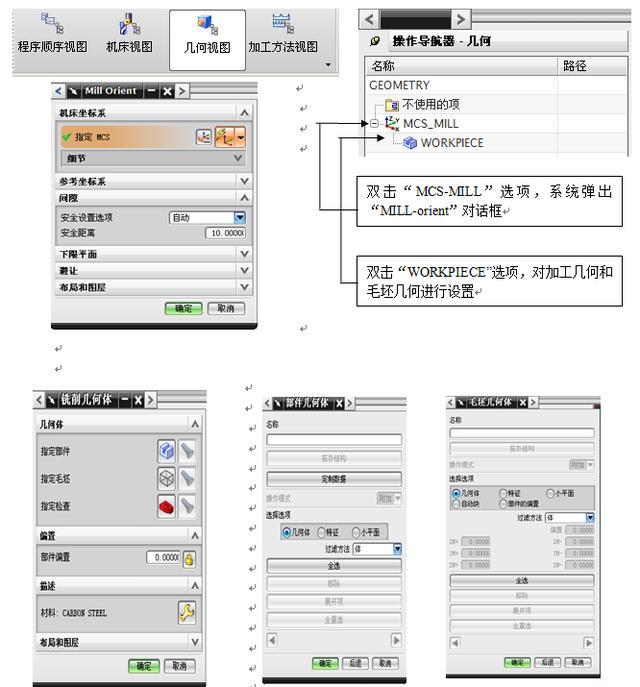 创建几何体可以指定毛坯、修剪和检查几何形状、加工坐标系MCS的方位和安全平面等参数以给后续操作继承。不同的操作类型需要不同的几何类型,平面操作要求指定边界,而曲面轮廓操作需要面或体作为几何对象。