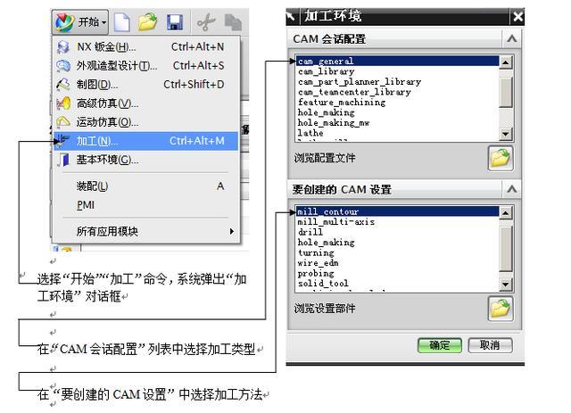 UG/CAM加工环境是指进入UG的制造模块后进行加工编程作业的软件环境,它是实现UG/CAM加工的起点。点击“开始”菜单,在弹出的菜单中选择“加工”命令,便进入UG的加工应用模块。