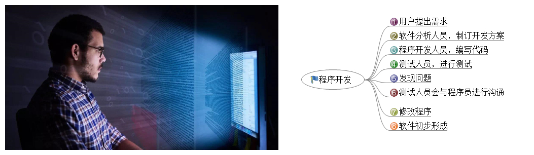 从过程可以看出,程序员完成的工作是编写代码,在整个软件的开发过程中最为重要。