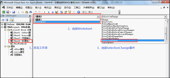 【Step3】:在右边的菜单栏中选择SelectionChange事件(选取改变时,触发代码);
