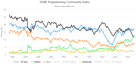 Python has won the TIOBE programming language of the year award! This is for the fourth time in the history, which is a record! The title is awarded to the programming language that has gained most popularity in one year. Python made a positive jump of 2.01% in 2020. Programming language C++ is a very close runner up with an increase of 1.99%. Other winners are C (+1.66%), Groovy (+1.23%) and R (+1.10%).