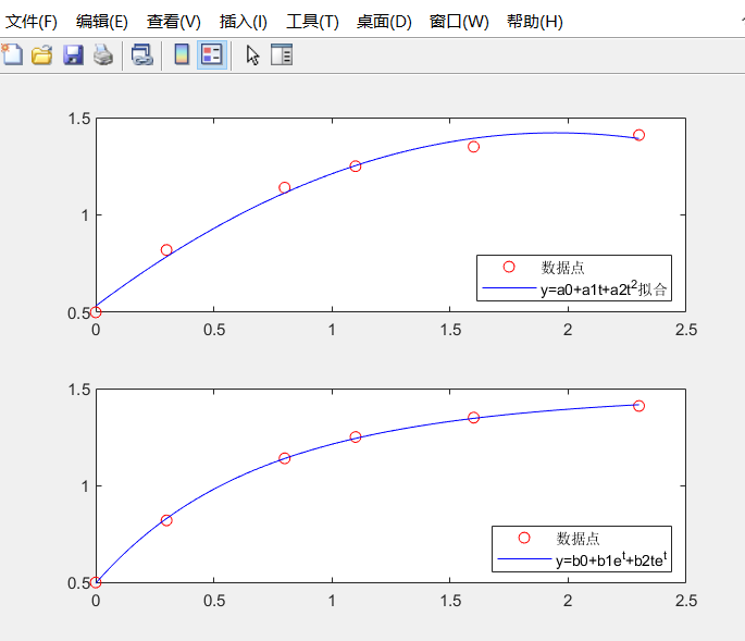 t=[0 0.3 0.8 1.1 1.6 2.3]; y=[0.5 0.82 1.14 1.25 1.35 1.41]; p1=polyfit(t,y,2); xt1=1:0.01:2.3; yt1=polyval(p1,xt1); z1=polyval(p1,t); wuchal=sqrt(sum(z1-y).^2); subplot(2,1,1) plot(t,y,'ro',xt1,yt1,'b') legend('数据点','y=a0+a1t+a2t^2拟合','location','southeast') p2=polyfit(exp(-t),y,2); xt2=1:0.01:2.3; yt2=polyval(p2,exp(-xt2)); z2=polyval(p2,t); wucha2=sqrt(sum(z2-y).^2); subplot(2,1,2) plot(t,y,'ro',xt2,yt2,'b') legend('数据点','y=b0+b1e^t+b2te^t','location','southeast')实验结果: