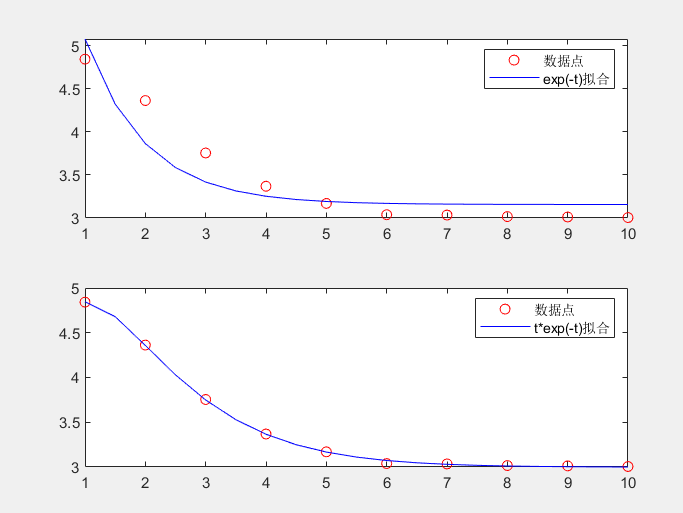 t=1:10; y=[4.842 4.362 3.754 3.368 3.169 3.038 3.034 3.016 3.012 3.005]; p1=polyfit(exp(-t),y,1); xt1=1:0.5:10; yt1=polyval(p1,exp(-xt1)); subplot(2,1,1) plot(t,y,'ro',xt1,yt1,'b') legend('数据点','exp(-t)拟合') p2=polyfit(t.*exp(-t),y,1); xt2=1:0.5:10; yt2=polyval(p2,xt2.*exp(-xt2)); subplot(2,1,2) plot(t,y,'ro',xt2,yt2,'b') legend('数据点','t*exp(-t)拟合')实验结果: