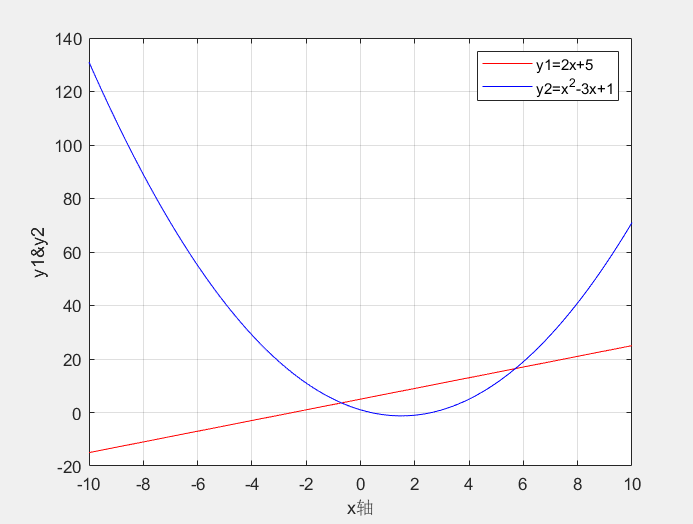 x=-10:0.01:10; y1=2*x+5; y2=x.^2-3*x+1; plot(x,y1,'r',x,y2,'b'); xlabel('x') ylabel('y1&y2') legend('y1=2x+5','y2=x^2-3x+1') grid on实验结果: