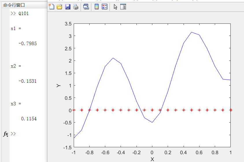 x=-1:0.1:1; y=exp(x)-1.5*cos(2*pi*x); y0=0; plot(x,y,'b',x,y0,'r*'); fun=@(x) exp(x)-1.5*cos(2*pi*x); x1= fzero(fun,-0.8) x2= fzero(fun,0) x3= fzero(fun,0.8) xlabel('X'); ylabel('Y');实验结果: