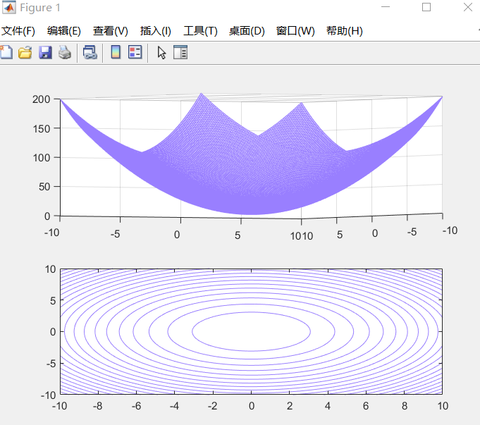 [x,y]=meshgrid(-10:0.1:10); z=x.^2+y.^2+sin(x*y); subplot(2,1,1) mesh(x,y,z) subplot(2,1,2) colormap([0.6 0.5 1]) contour(x,y,z,20)实验结果: