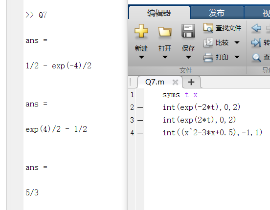 分析:syms用于申明变量,int()用于求解积分,参数分别是被积函数、积分下限和积分上限。