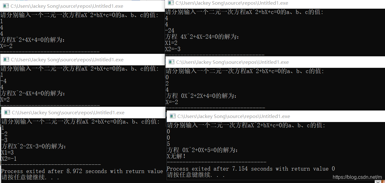 printf("请分别输入一个二元一次方程aX^2+bX+c=0的a、b、c的值:\n");