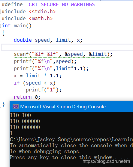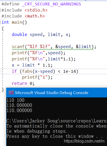 在上图中,我用scanf()函数输入了110和100分别给了speed和limit,然后我用printf()函数输出speed的值,因为double型显示到小数点后六位,所以输出的是110.000000,然后我再输出limit乘11(数据类型自动转换,11为整型,转换为limit的double型)再除以10(同样涉及到数据类型的自动转换),输出的结果也为110.000000。然后将limit乘11再除以10的值赋给x,比较x与speed之间的大小,如果speed小于x则输出1,否则不输出。运行结果也看到了,并且根据数学运算结果,肯定不小于,所以也没有输出1。这没毛病,但是我把代码改一下,问题就来了。
