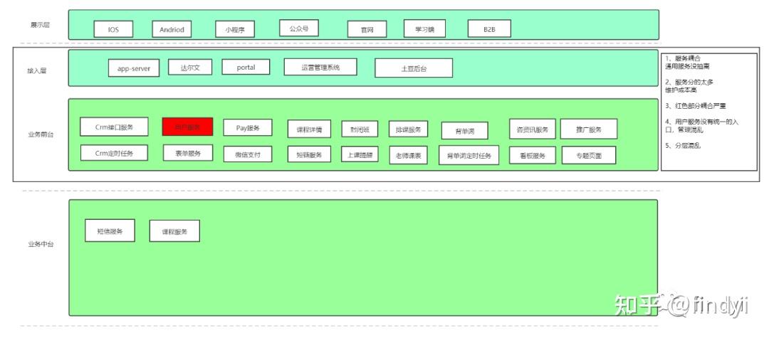 服务耦合,通用服务没有抽离服务分的太多,服务治理及维护成本高用户服务没有统一的入口,管理混乱分层混乱,没有面向业务的分层思想重构后的服务体系应该能支撑公司业务后续2年的发展。并且我们是在优先支撑业务需求的前提下做完整个服务重构。