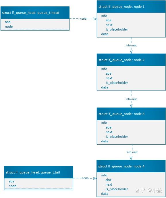 设计struct lf_queue_head用于存储队头,队尾,它的node成员,分别指向队头和队尾。struct lf_queue_node表示队列节点,其中包含info子成员,用于原子操作。info.next指向tail方向的下一节点。struct lf_queue_node和struct lf_queue_head都有aba成员,用于操作计数统计以避免ABA问题。