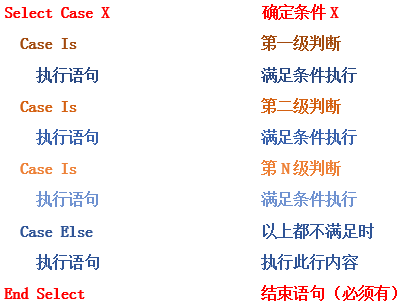 因为IF函数已深入人心,所以我们开篇就讲解了IF判断语句,其实在EXCEL VBA中还有另一种判断语句的写法,就是SELECT判断语句,语法如下: