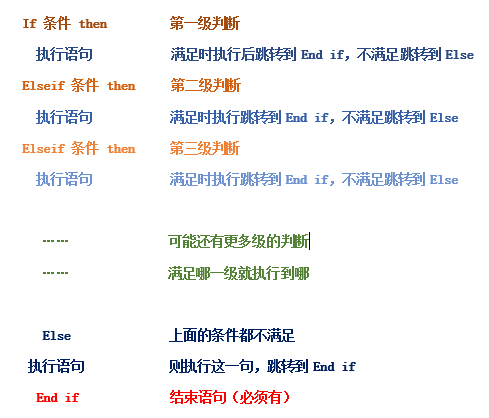 这就是IF判断语句的完整语法,和IF函数一样,当满足某一级判断时,返回相应结果,并跳出此次判断。这其中的ElseIF语句,就相当于IF函数的嵌套使用,Else就相当于IF函数的False_value。