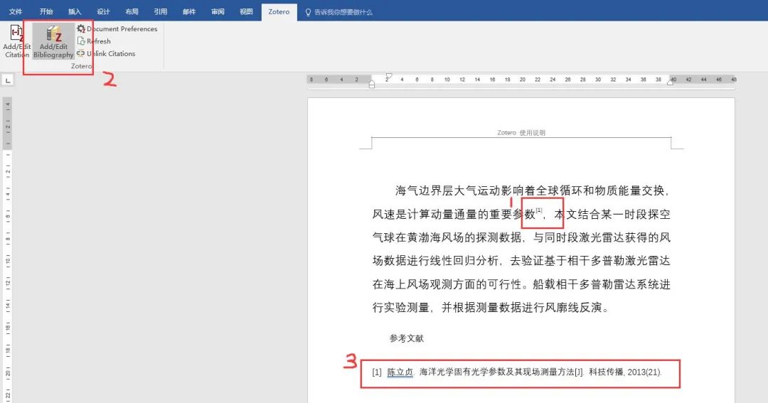 5. 其他文献可依次插入。Zotero有个特别强大的功能,如果中间一部分引文被删除,点击工具栏的Refresh,上角标以及参考文献会自动更新。
